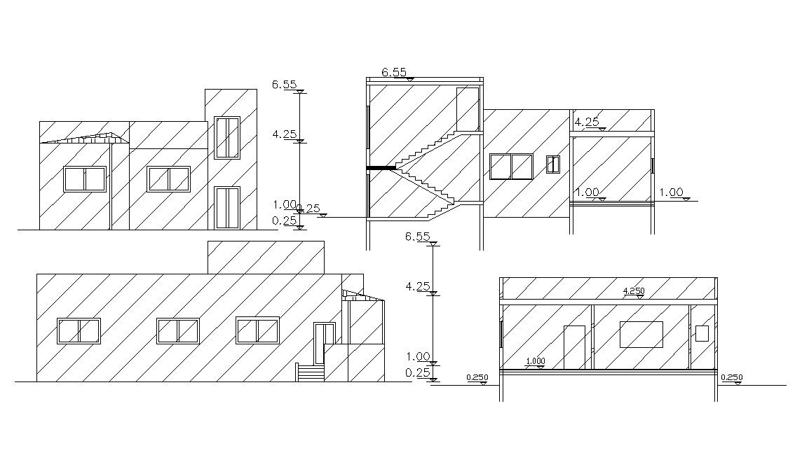 The architecture drawing include a doors and windows, staircase, hatching, floor level, etc. this drawing elevation height is 6.55 meter. download CAD file.
