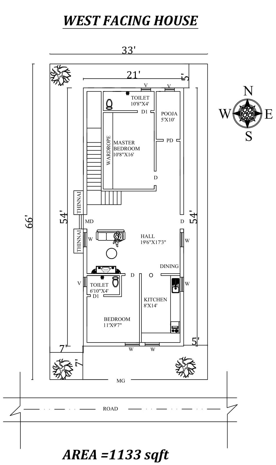 Autocad Drawing file shows 33' X66' Fully Furnished 2bhk West facing House Plan As Per Vastu Shastra. The total buildup area of this house is 1133 sqft. The kitchen is in the Southeast direction. Dining near the kitchen is in the East direction. The puja room is in the northeast. The living area is available in the center of the house. The master bedroom is available in the north direction with the attached toilet is in the north direction. kid's bedroom is in the southwest direction. A staircase is available in the Northwest Direction inside of the house. Road Available in the south direction.Download Autocad Drawing file and PDF file.