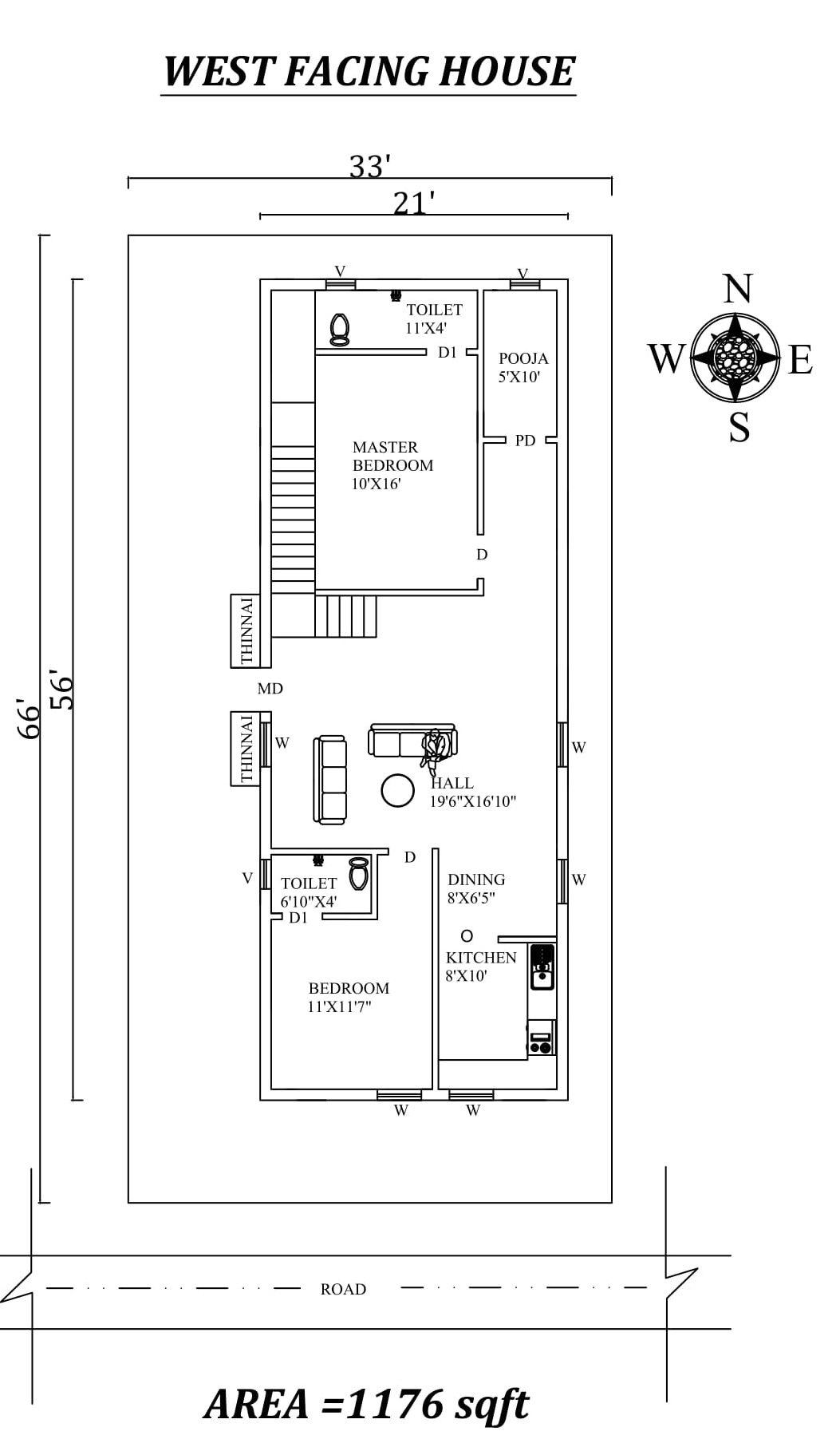 Autocad Drawing file shows 21'X66' 2bhk West facing House Plan As Per Vastu Shastra. The total buildup area of this house is 1176 sqft. The kitchen is in the Southeast direction. Dining near the kitchen is in the East direction. The puja room is in the northeast. The living area is available in the center of the house. The master bedroom is available in the north direction with the attached toilet is in the north direction. kid's bedroom is in the southwest direction. A staircase is available in the Northwest Direction inside of the house. Road Available in the south direction.Download Autocad Drawing file and PDF file.