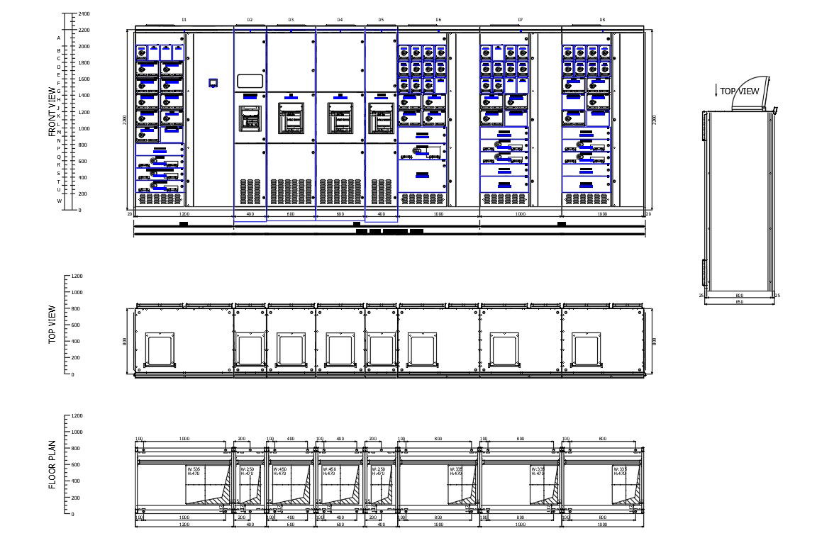 2D CAD drawing of electrical room drawing that shows front view, top view, and floor plan includes electrical board, meter board and socket detail. download electrical room drawing DWG file.