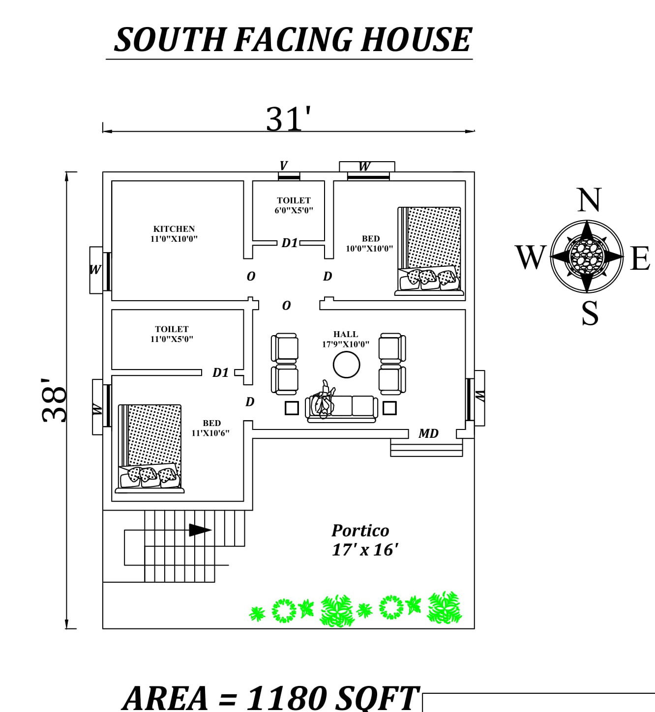 Autocad Drawing file shows 31'x38' 2bhk Awesome Furnished South facing House Plan Layout As Per Vastu Shastra. The total buildup area of this house is 1180 sqft. The kitchen is in the northwest direction. The Hall is Placed in the southeast direction. The master bedroom is available in the southwest direction with the attached toilet is in the west. The kid's bedroom is in the Northeast direction . The common toilet is in the north. A staircase is available in the southwest outside of the house. The road is Available in the South direction. Download Autocad Drawing file and PDF file.