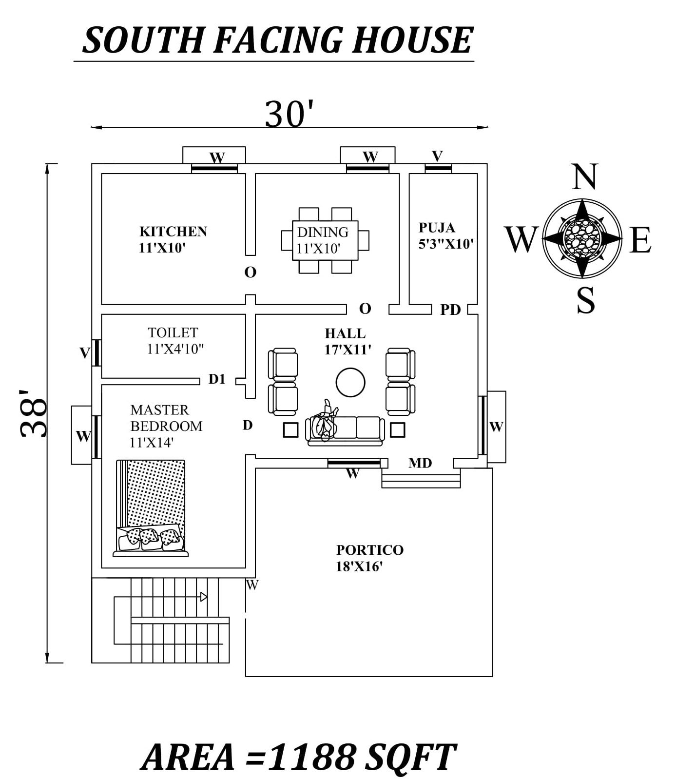 Autocad Drawing file shows 30'x38' Single bhk south-facing House Plan As Per Vastu Shastra. The total buildup area of this house is 1188 sqft. The kitchen is in the Northwest direction. Dining near the kitchen is in the North direction. The Hall is available in the Southeast direction. The master bedroom is available in the southwest direction with the attached toilet is in the west. The puja room is placed in the northeast direction. A staircase is available on the southwest outside of the house. The Common toilet is available in the southwest direction under stairs. The Portico is available in the southeast direction. Road Available in the South direction.Download Autocad Drawing file and PDF file.
