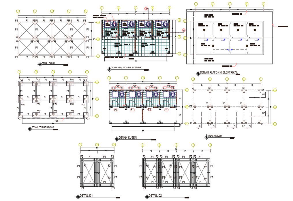 2d CAD drawing of toilet plan design that shows the floor plan with tile detail, foundation plan with centerline dimension detail and also has an electrical layout plan design DWG file.