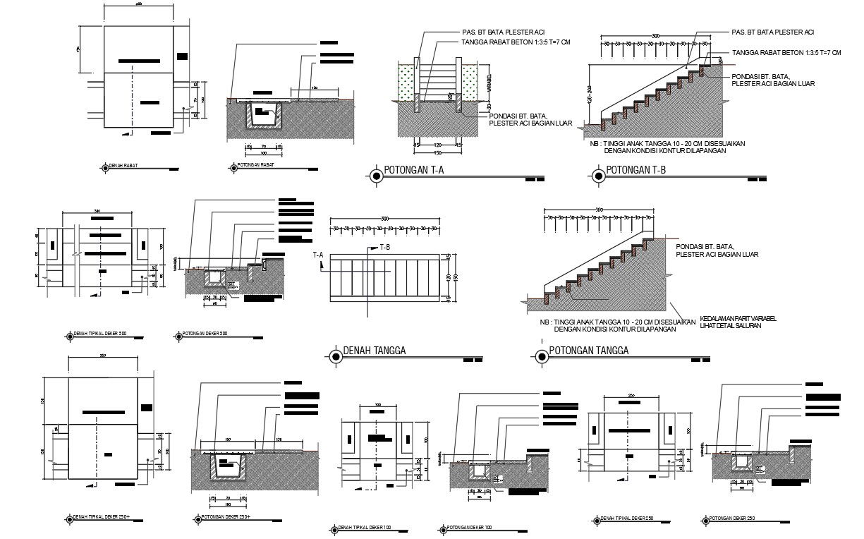 RCC construction working section and elevation design that shows planter box and staircase design with dimension detail. download free DWG file of the concrete planter box and staircase design.