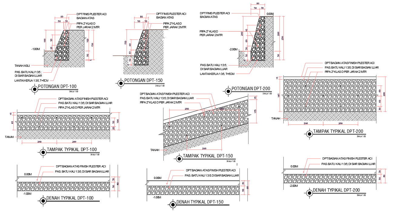 RCC concrete potongan construction working drawing that shows wall column foundation detail with dimension and description detail. download free DWG file of the construction wall footing detail DWG file.