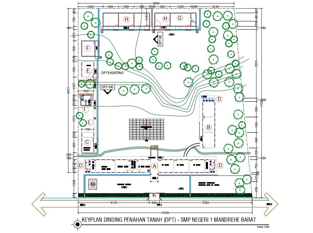 The municipal office master plan drawing that shows landscaping garden, build-up area and compound wall design with dimension detail. download free government municipal office plan drawing DWG file.