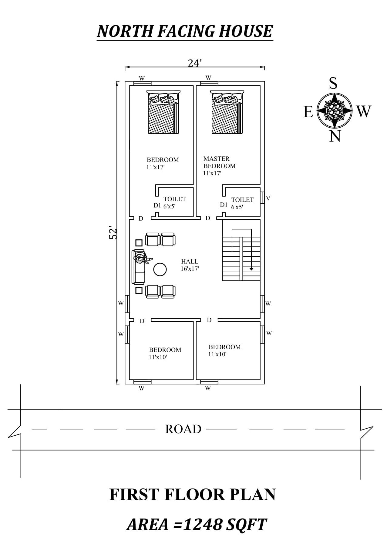 Autocad Drawing file shows 24'x52' North Facing First floor House Plan As Per Vasthu Shastra. The total buildup area of this house is1248 sqft. The Hall Placed in the center of the house The master bedroom available in the southwest direction with the attached toilet is in the west direction. kid's bedroom is in the southeast direction with the attached toilet available in the north direction. The guest bedroom is available in the northwest direction. The bedroom is in the northeast. A staircase is available on the west inside of the house. Download Autocad Drawing file and PDF file.