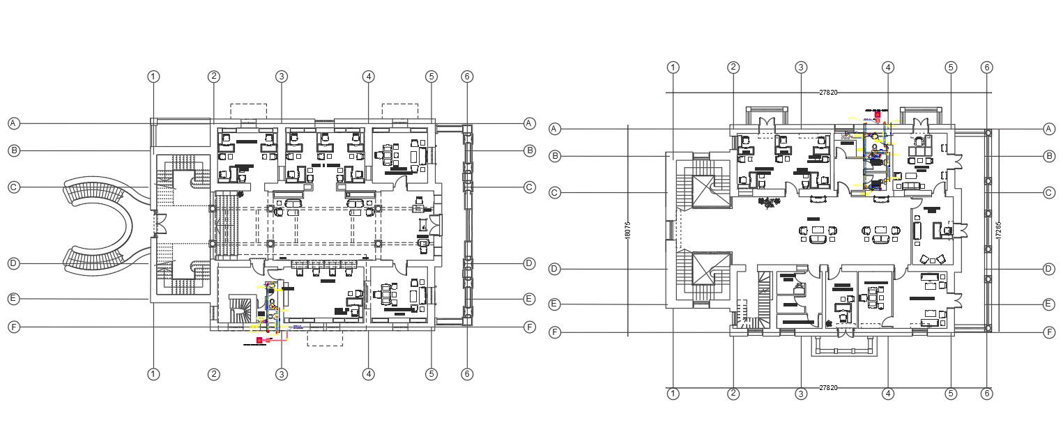 The Architecture AutoCAD drawing of office furniture layout plan with a centerline plan design that shows ground floor and first-floor plan includes manager cabins, work desk, waiting area, reception and toilet plan. download office plan drawing DWG file.