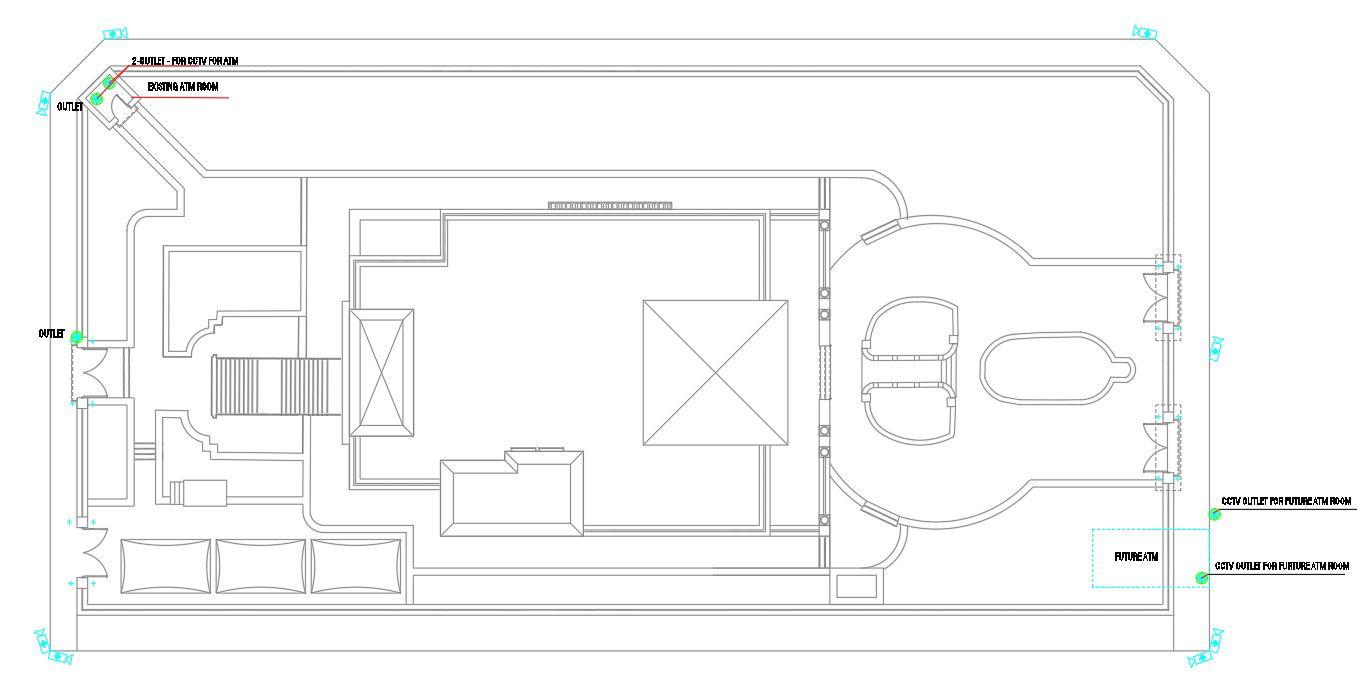 Download free DWG file of office building master plan top view design that shows build-up area and compound boundary wall design with the main entrance way marking detail.