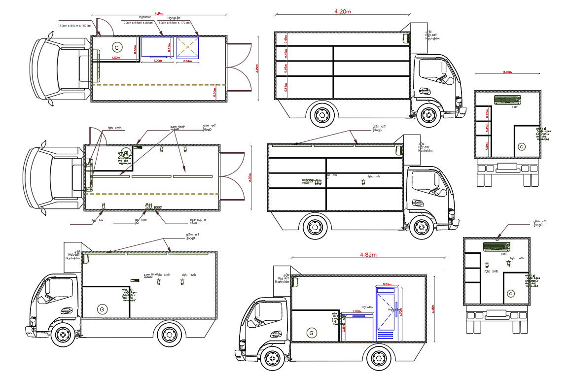 2D CAD drawing of ice cream vehicle CAD blocks all side elevation design that shows storage refrigerator and shutter window. download DWG file of ice cream delivers van design CAD blocks.