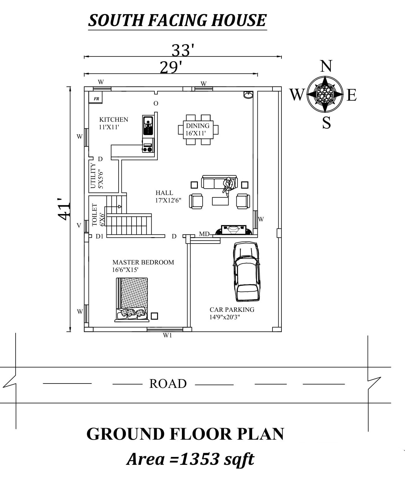 Autocad Drawing file shows 33'X41' Single bhk south-facing House Plan As Per Vastu Shastra. The total buildup area of this house is1353 sqft. The kitchen is in the Northwest direction. Dining near the kitchen is in the Northeast direction. The Hall is available in the Southeast direction. The master bedroom is available in the southwest direction. A staircase is available on the west inside of the house. The Common toilet is available understairs. The Portico/car parking is available in the southeast direction. Road Available in the South direction.Download Autocad Drawing file and PDF file.