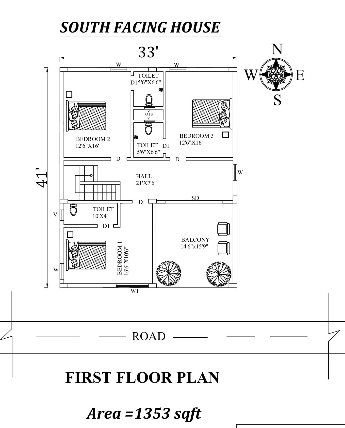 Autocad Drawing file shows Amazing 33'X41' 3bhk South facing First floor House Plan As Per Vastu Shastra. The total buildup area of this house is 1353 sqft. The master bedroom is available in the southwest direction with the attached toilet is in the west direction. The guest bedroom is in the Northwest direction with the attached toilet in the north direction. kid's Bedroom placed in the northeast direction with the attached toilet is in the north direction. A staircase is available on the west inside of the house. The common toilet is available in the west direction under the staircase. The balcony is available in the Southeast direction of the house. The road is Available in the South direction. Download Autocad Drawing file and PDF file.