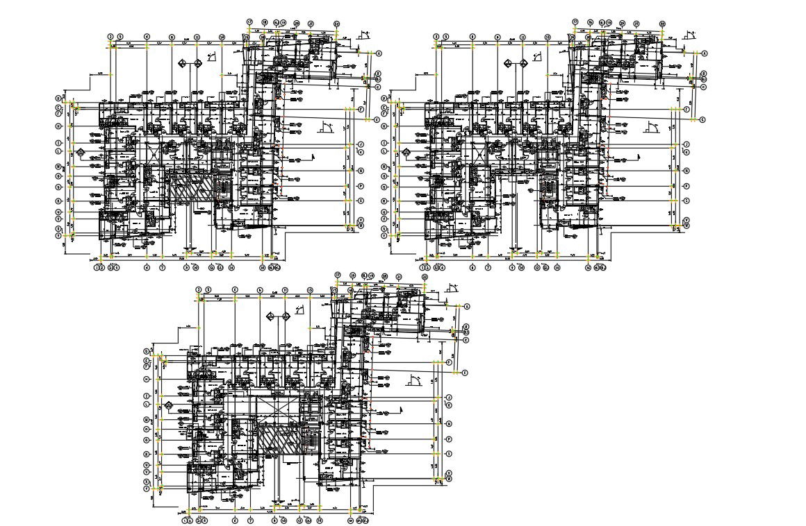 The hotel floor plan with centre line design CAD drawing shows 3 different floor plan with dimension detail. download hotel project layout plan design DWG file.