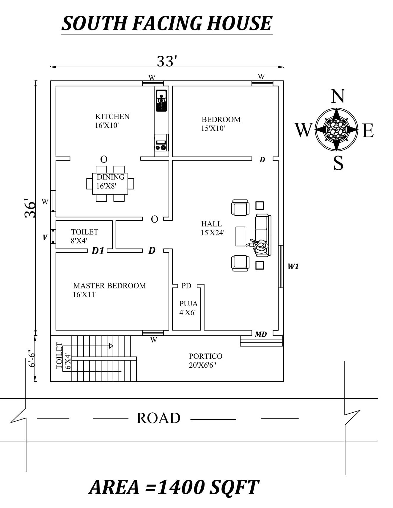 Autocad Drawing file shows 33'X36' 2bhk Awesome South facing House Plan As Per Vastu Shastra. The total buildup area of this house is 1400 sqft. The kitchen is in the northwest direction. Dining near the kitchen is in the west direction. The Hall Placed in the southeast direction. The puja room is in the south. The master bedroom is available in the southwest direction with the attached toilet is in the west. The kid's bedroom is in the Northeast direction. A staircase is available in the southwest outside of the house. The common toilet is available in the southwest direction under stairs. The road is Available in the South direction. Download Autocad Drawing file and PDF file.