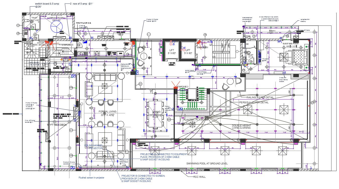 the architecture apartment furniture layout plan design that shows bedrooms, double-height living and dining area, modular kitchen, formal living room and a wide deck with swimming pool design. also has all dimension detail and central AC detail. download luxurious apartment plan design DWG file.