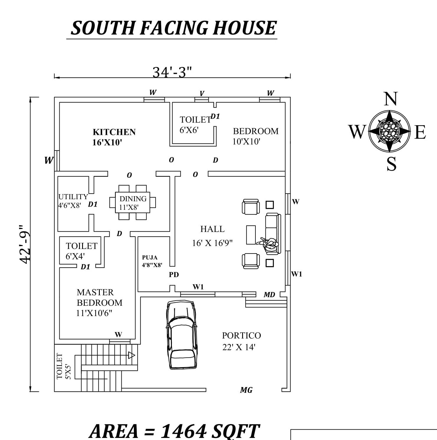 Autocad Drawing file shows 34'X42' 2bhk Awesome South facing House Plan As Per Vastu Shastra. The total buildup area of this house is 1464 sqft. The kitchen is in the northwest direction. Dining near the kitchen is in the west direction. The utility is placed near the kitchen is in the west direction. The Hall is Placed in the southeast direction. The puja room is in the west. The master bedroom is available in the southwest direction with the attached toilet is in the west. The kid's bedroom is in the Northeast direction with the attached toilet is in the north. A staircase is available in the southwest outside of the house. The common toilet is available in the southwest direction under stairs. The road is Available in the South direction. Download Autocad Drawing file and PDF file.