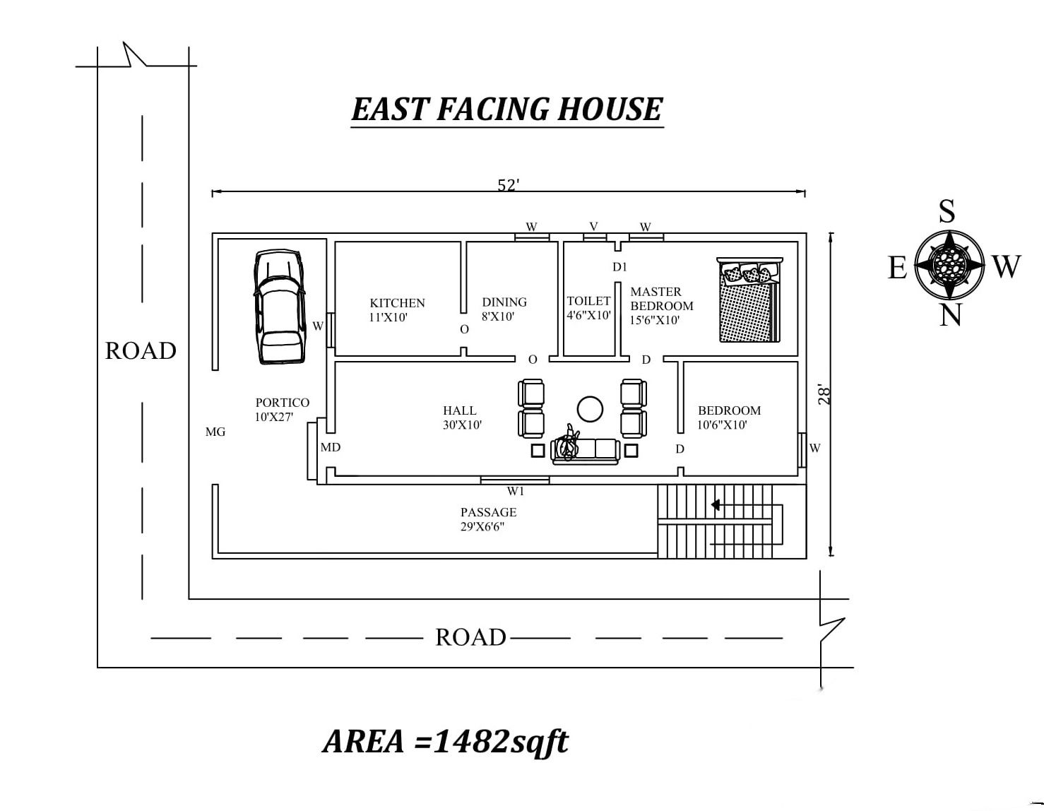 Autocad Drawing file shows 52'X28' Splendid 2bhk East facing House Plan Layout As Per Vastu Shastra. The total buildup area of this house is 1482 sqft. The kitchen is in the Southeast direction. Dining near the kitchen is in the south direction. The living area is available in the Northeast direction. The master bedroom is available in the southwest direction with the attached toilet is in the south direction. kid's bedroom is in the northwest direction. A staircase is available in the Northwest Direction outside of the house. Common toilet under stairs. Portico is available in the northeast direction of the house. Road Available in the east direction.Download Autocad Drawing file and PDF file.