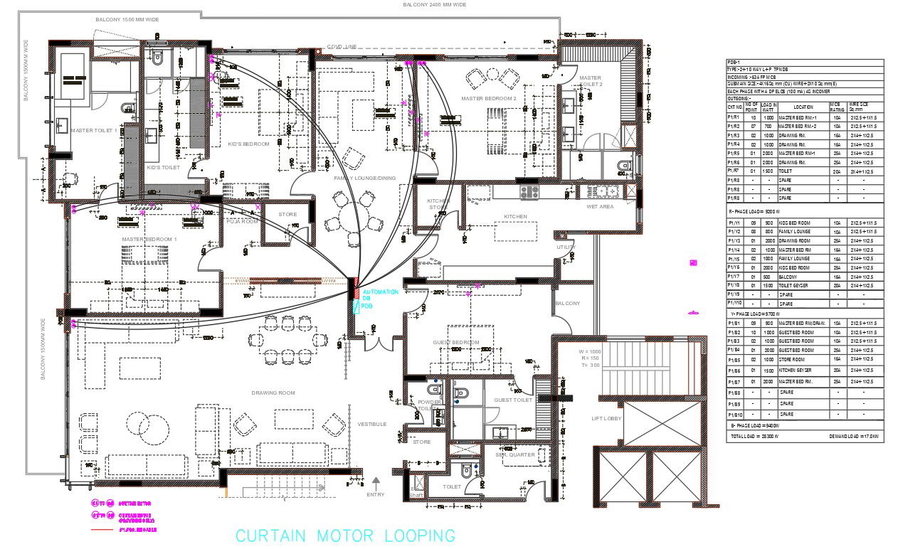 The architecture luxurious 4 BHK house furniture layout plan design that shows 2 master bedroom with master toilet plan, kids and guest bedrooms attached toilet, family lounge dining, modular kitchen, pooja room, storeroom and drawing room with interior house plan design. download luxurious house plan with description detail DWG file.