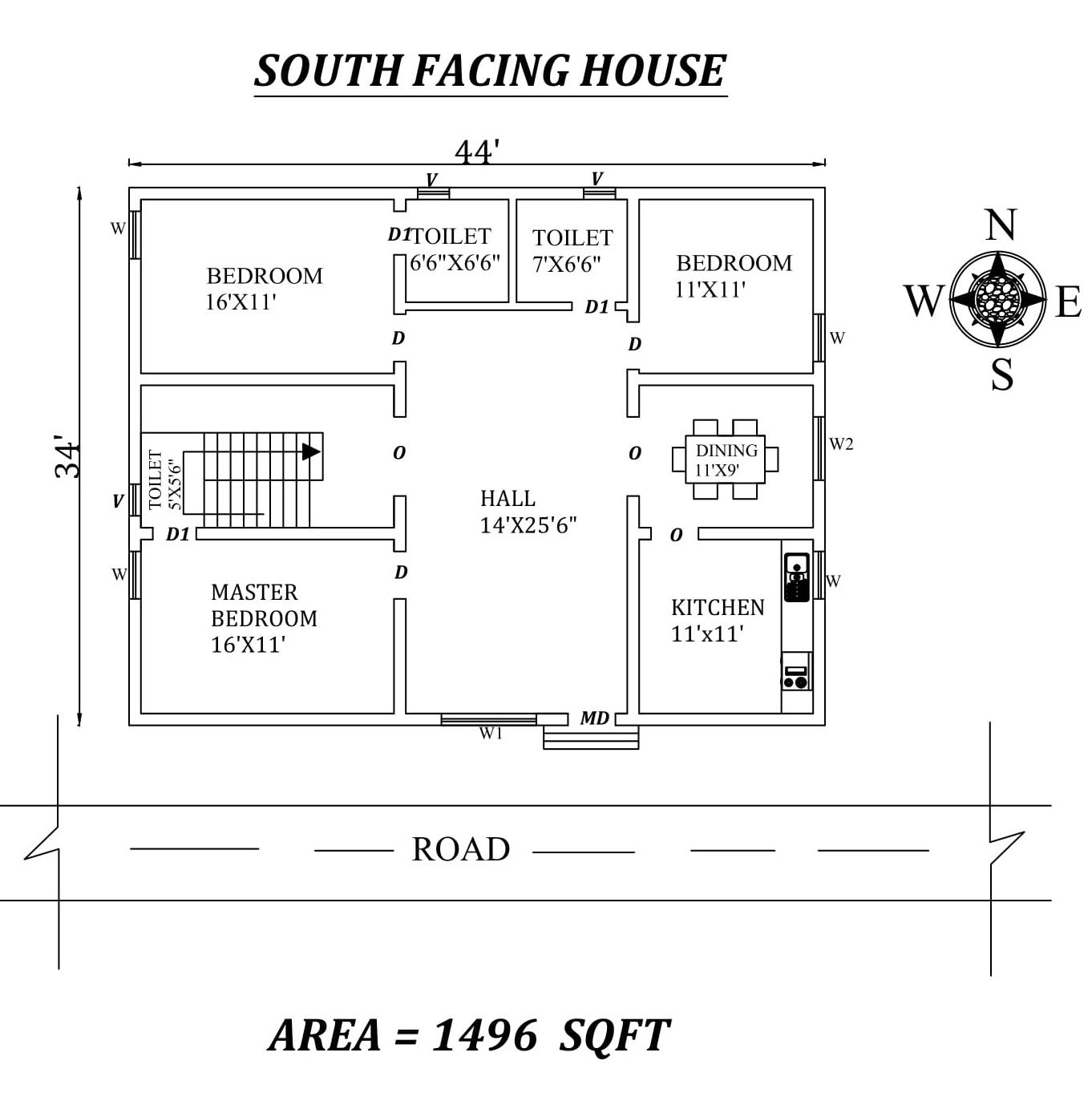 Autocad Drawing file shows Amazing 44'X34' 3bhk South facing House Plan As Per Vastu Shastra. The total buildup area of this house is 1496 sqft. The kitchen is in the southeast direction. Dining near the kitchen is in the east. The Hall is Placed in the south direction center of the house. The master bedroom is available in the northwest direction with the attached toilet in the north direction. The guest bedroom is in the Northeast direction with the attached toilet in the north direction. kid's Bedroom placed in the northeast direction with the attached toilet is in the north direction. A staircase is available in the west inside of the house. The common toilet is available in the west direction under the staircase. The road is Available in the South direction. Download Autocad Drawing file and PDF file.