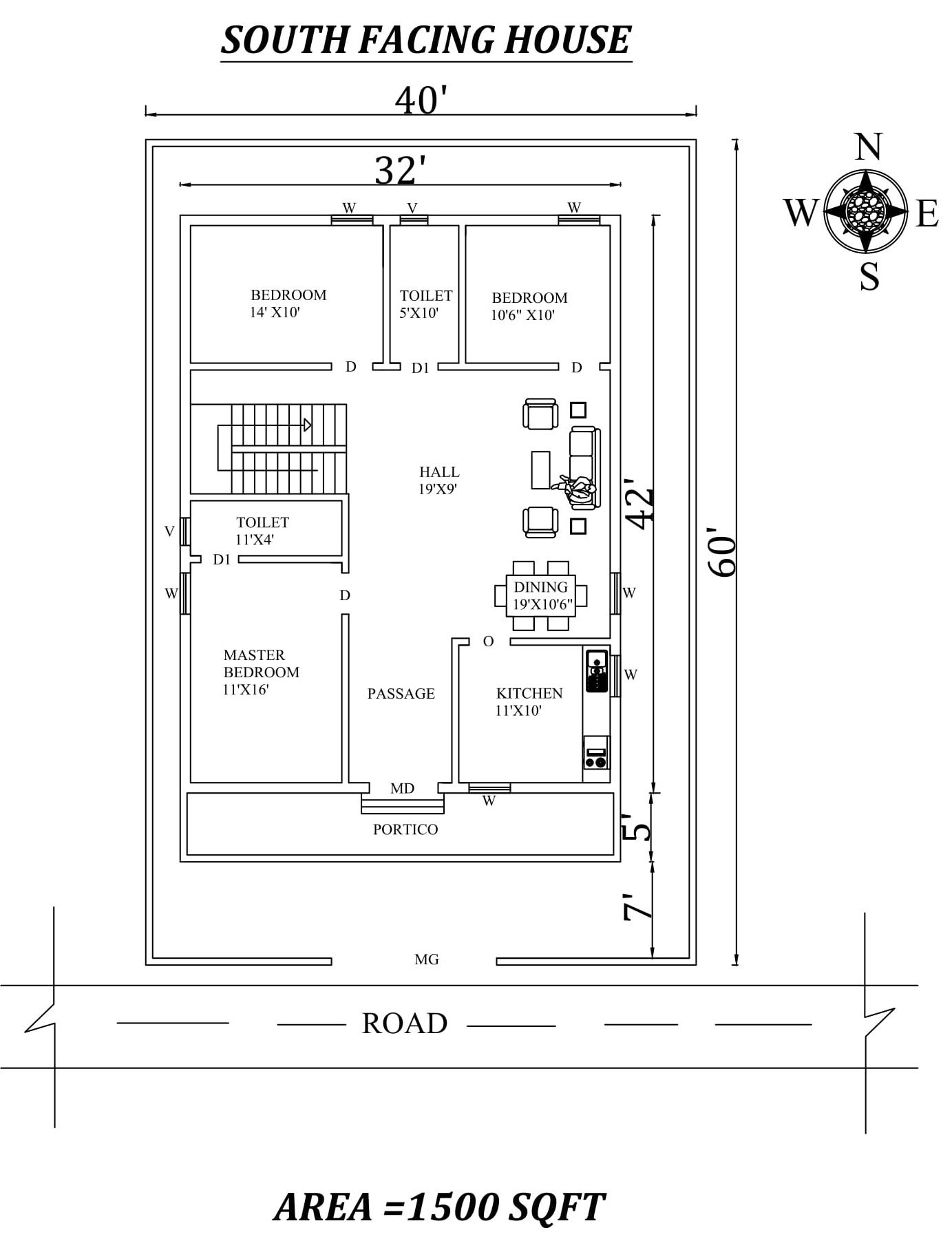 Autocad Drawing file shows Amazing 40'X60' 3bhk South facing House Plan As Per Vastu Shastra. The total buildup area of this house is 1500 sqft. The kitchen is in the southeast direction. The dining near the kitchen is in the east. The Hall Placed in the east direction. The master bedroom is available in the southwest direction with the attached toilet is in the west direction. The guest bedroom is in the Northwest direction. The common toilet is available in the north direction. kid's Bedroom placed in the northeast direction A staircase is available on the west inside of the house. The road is Available in the South direction. Download Autocad Drawing file and PDF file.