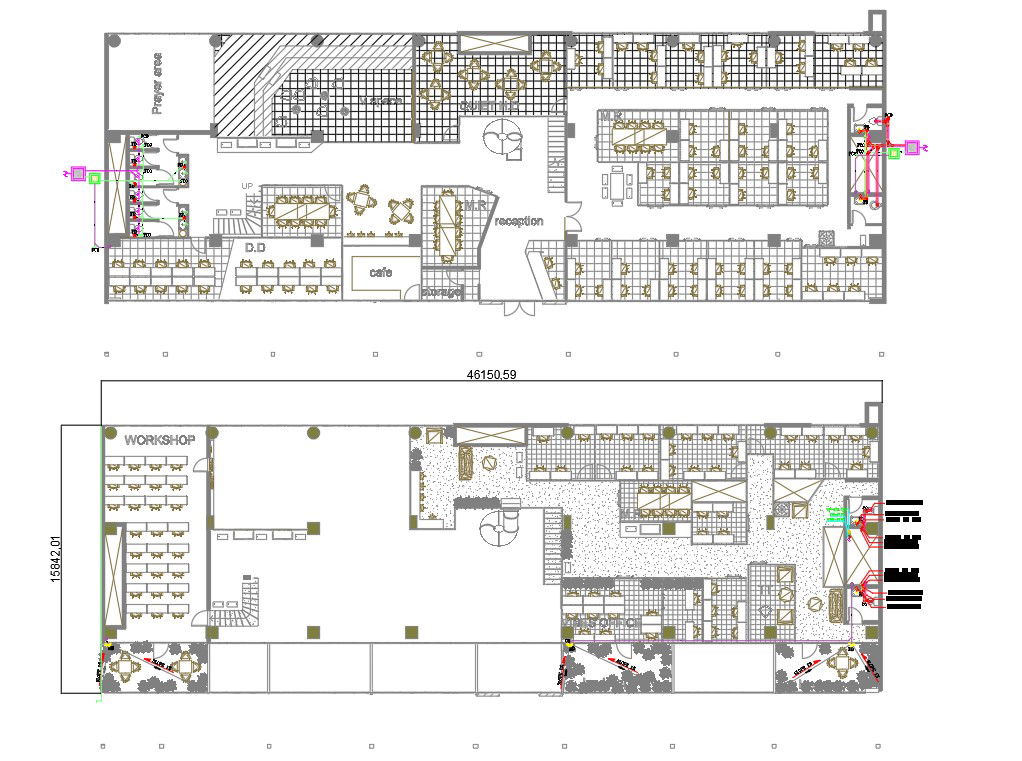 The ground floor and first-floor plan of restaurant furniture layout plan design that shows the dining area, workshop, cafe, reception, toilet and landscaping design. download restaurant plan design DWG file.