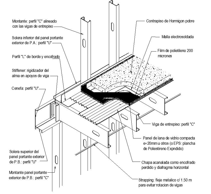 Poor Concrete Underlayment, Panel of compact glass wool e = 20mm or others (or EPS: polystyrene sheet expired), Corrugated sheet as lost formwork and horizontal diaphragm, Stiffener: web stiffener on beam supports.etc detail.