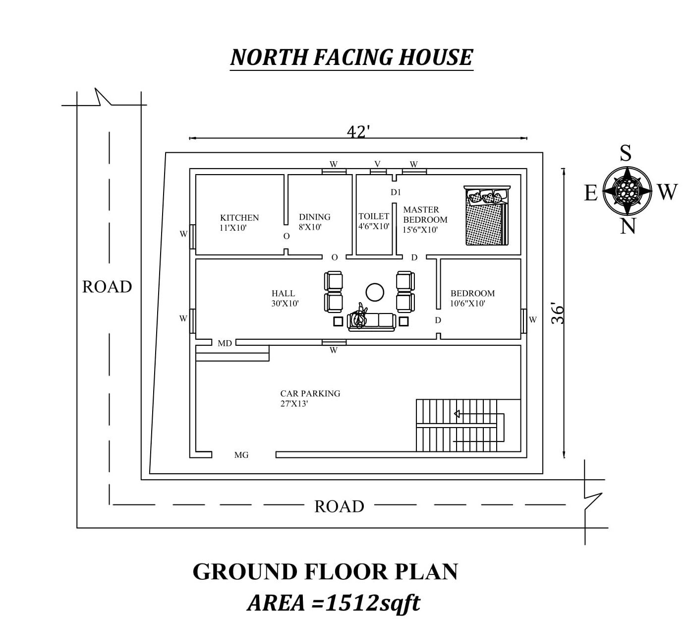 AutoCAD DWG file shows 42'X36' Amazing North facing 2bhk ground floor house plan as per vastu Shastra. The Buildup area of this house plan is 1512 sqft. The master bedroom is in the southwest direction with the attached toilet in the south and the children's bedroom is in the northwest direction. kitchen is placed in the southeast, Dining room available in the South. Hall and portico are available in the northeast direction. Staircase placed in the northwest direction outside of the house. Download Autocad DWG and PDF file format of this house.