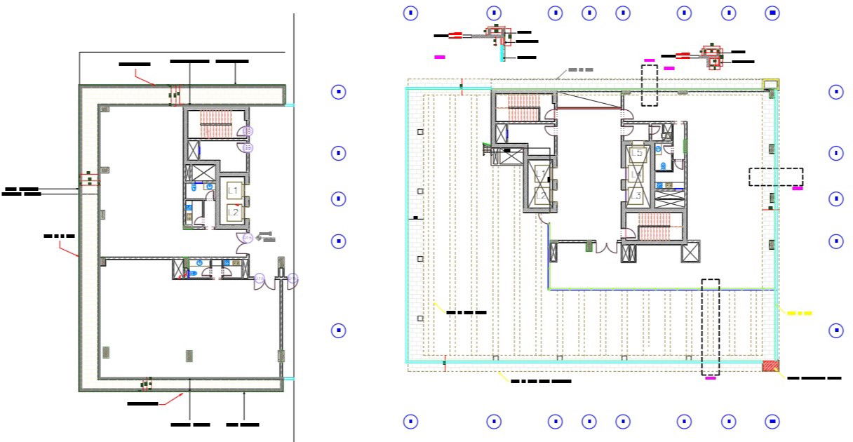 The corporate office layout plan design that shows the build-up area, lift, staircase, boundary wall and pergola design. download corporation office plan design DWG file.
