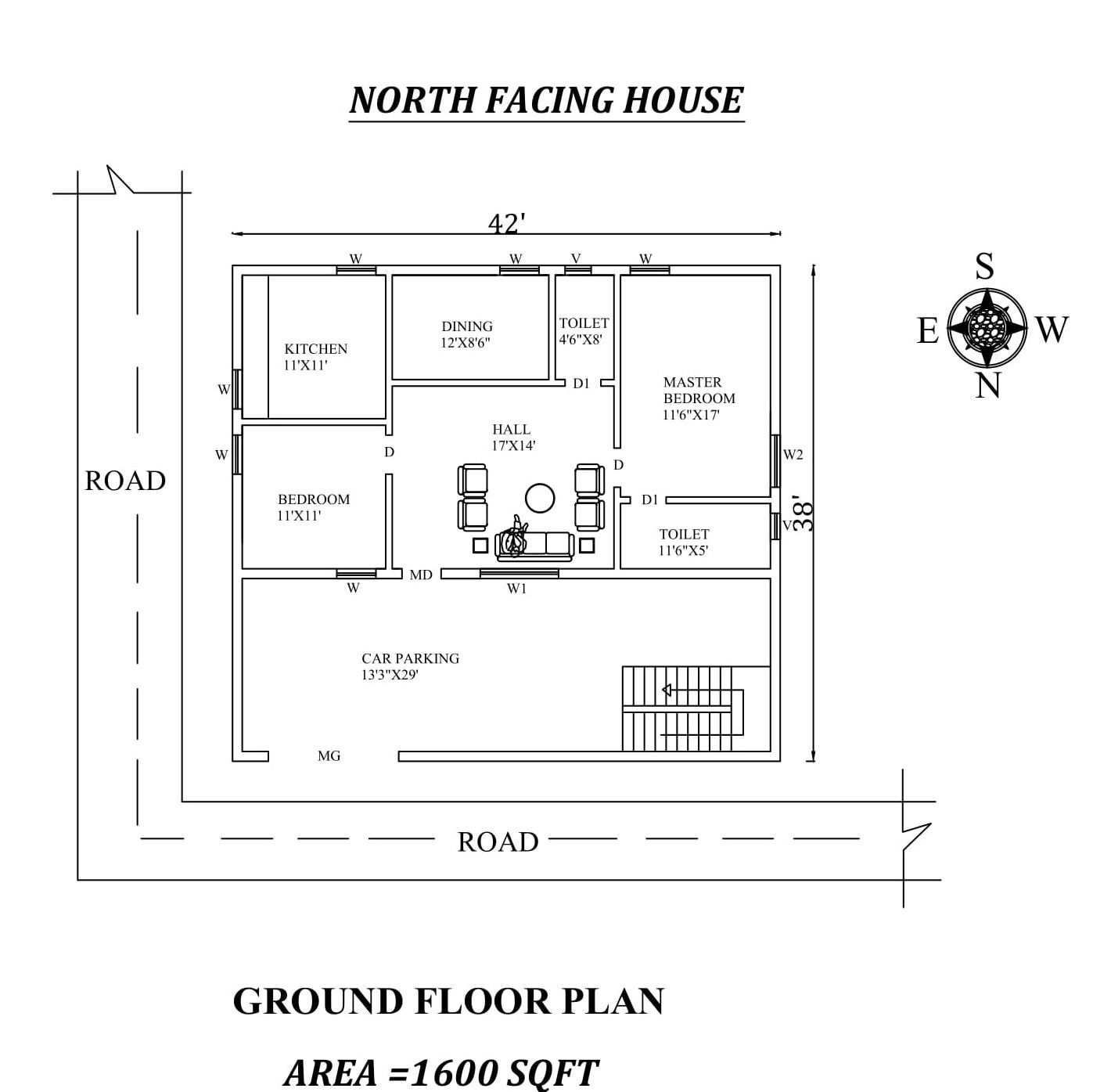 AutoCAD DWG file shows 42'X 38' Amazing North facing 2bhk house plan as per Vastu Shastra. The Buildup area of this house plan is 1600 sqft. The master bedroom is in the southwest direction with the attached toilet in the West and the children's bedroom is in the east direction. kitchen is placed in the southeast, Dining room available in the South. The common toilet is available in the south. Hall and portico are available in the north direction. Staircase placed in the northwest direction outside of the house. Download Autocad DWG and PDF file format of this house.