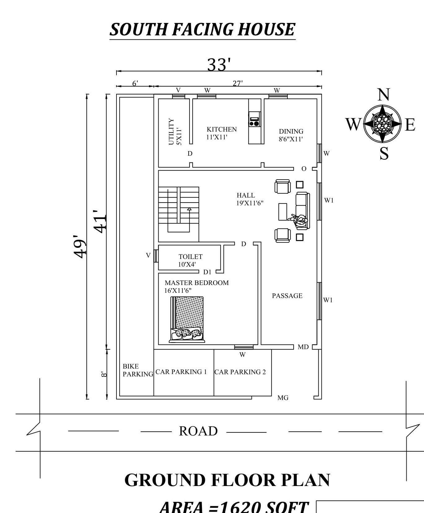 Autocad Drawing file shows 27'X41' Single bhk south-facing Ground floor House Plan As Per Vastu Shastra. The total buildup area of this house is 1620 sqft. The kitchen is in the North direction. Dining near the kitchen is in the Northeast direction. The utility is placed in the northwest. The Hall is available in the east direction. The master bedroom is available in the southwest direction with the attached toilet is in the west. A staircase is available on the west inside of the house. The Portico/car parking is available in the south direction. Road Available in the South direction.Download Autocad Drawing file and PDF file.