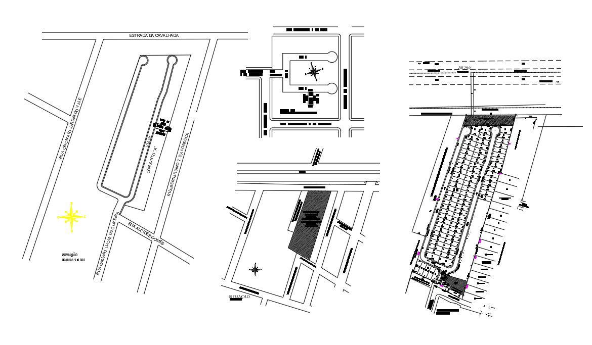 Download free DWG file of urban town plan design that shows direction symbol, exiting building and residence home plotting detail with road networks.