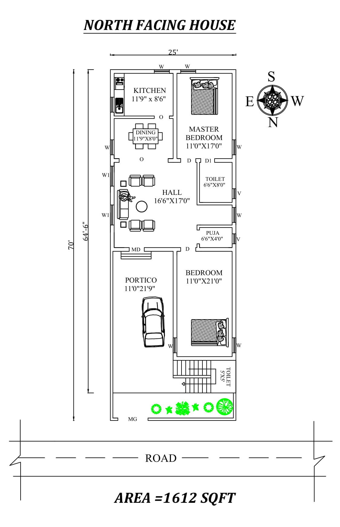 AutoCAD DWG file shows 25'X64' Amazing North facing 2bhk house plan as per Vastu Shastra. The Buildup area of this house plan is 1612 sqft. The master bedroom is in the southwest direction with the attached toilet in the West and the children's bedroom is in the northwest direction. kitchen is placed in the southeast, Dining room available in the east. Hall and portico are available in the northeast direction. The puja room is in the west. Staircase placed in the northwest direction outside of the house. The common toilet is available under stairs. Download Autocad DWG and PDF file format of this house.