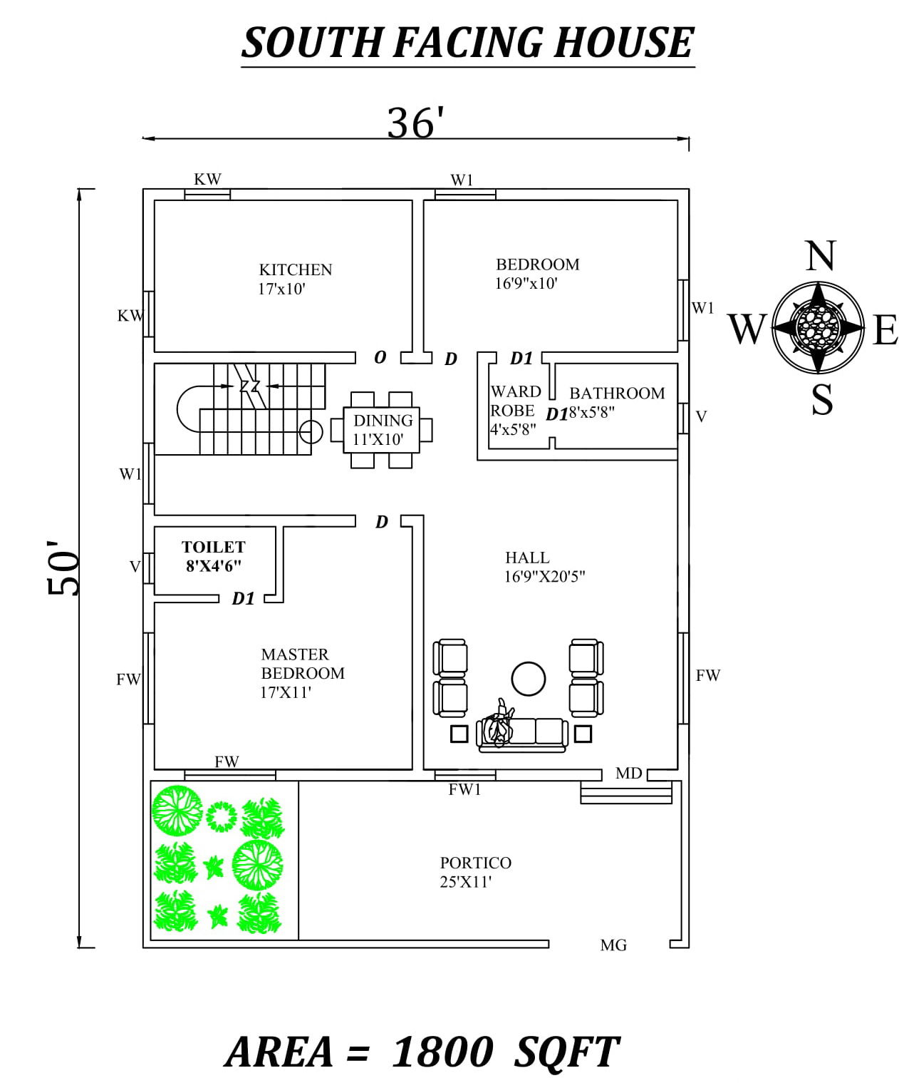 Autocad Drawing file shows 36'X50' 2bhk Awesome South facing House Plan As Per Vastu Shastra. The total buildup area of this house is 1800 sqft. The kitchen is in the northwest direction. Dining near the kitchen. The Hall Placed in the southeast direction. The master bedroom is available in the southwest direction with the attached toilet is in the west. The kid's bedroom is in the Northeast direction with the attached toilet is in the east. A staircase is available in the west inside of the house. Road Available in the South direction.Download Autocad Drawing file and PDF file.
