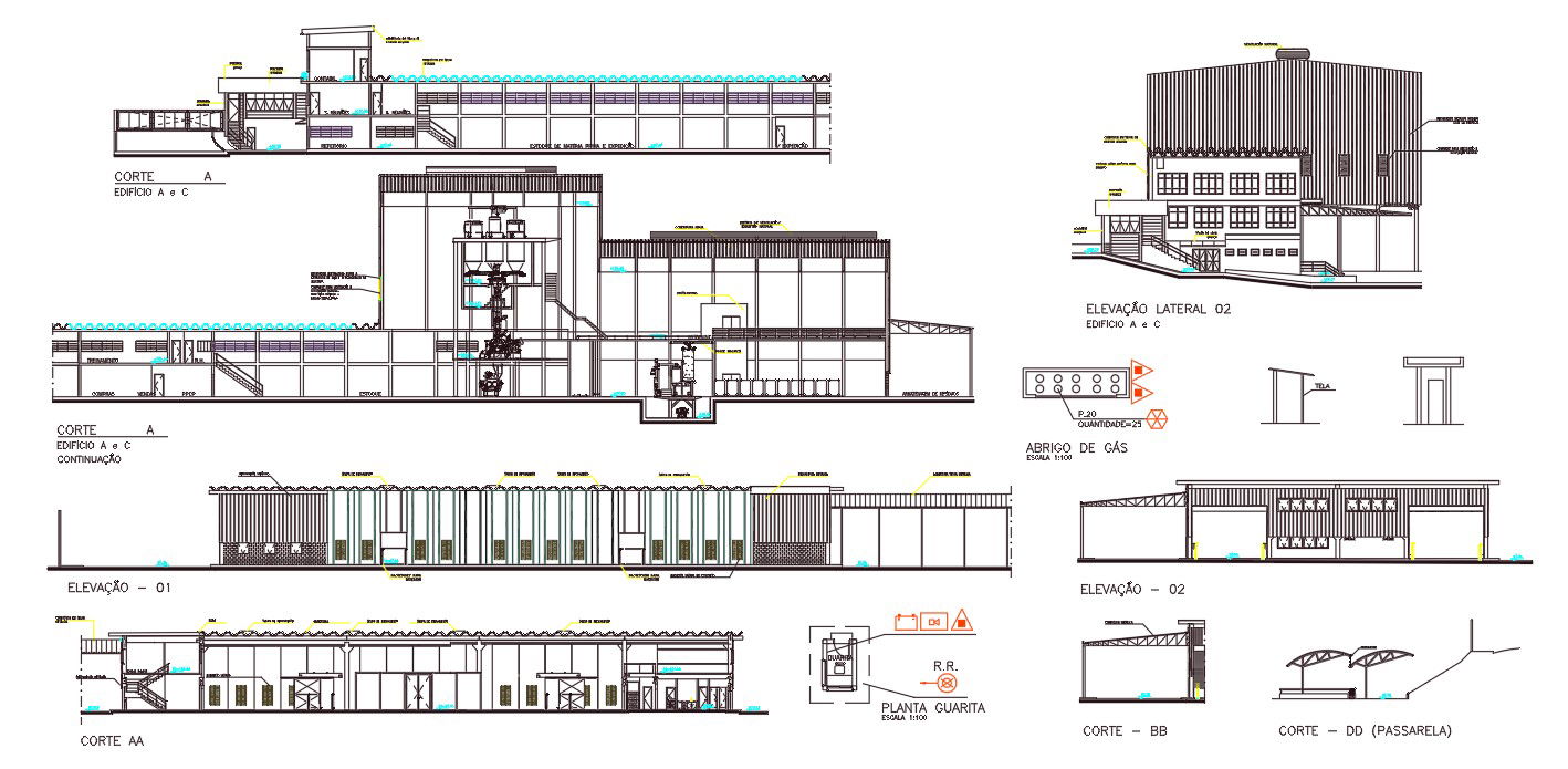 AutoCAD drawing of chemical industrial building section drawing and elevation design that shows the boiler. storage material and building structure design. download chemical factory building design DWG file.
