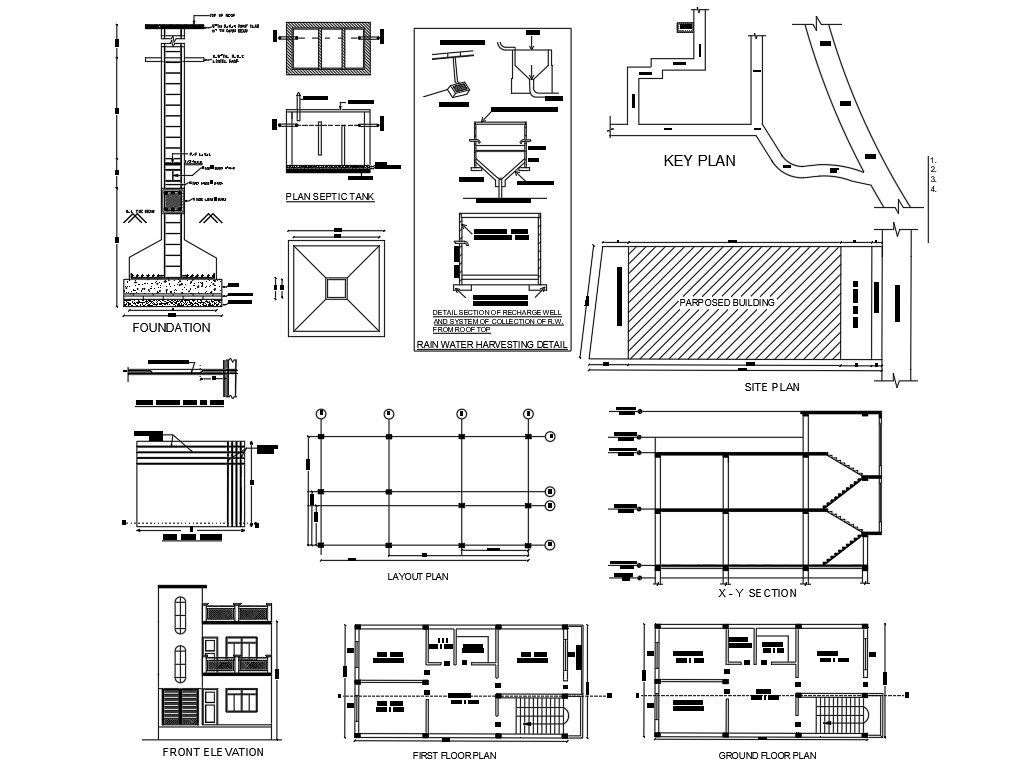 2 Storey residence house ground floor plan and first-floor plan that shows column layout with centre line detail, site plan, key plan and front elevation design. download 2 storey residence house project drawing DWG file.