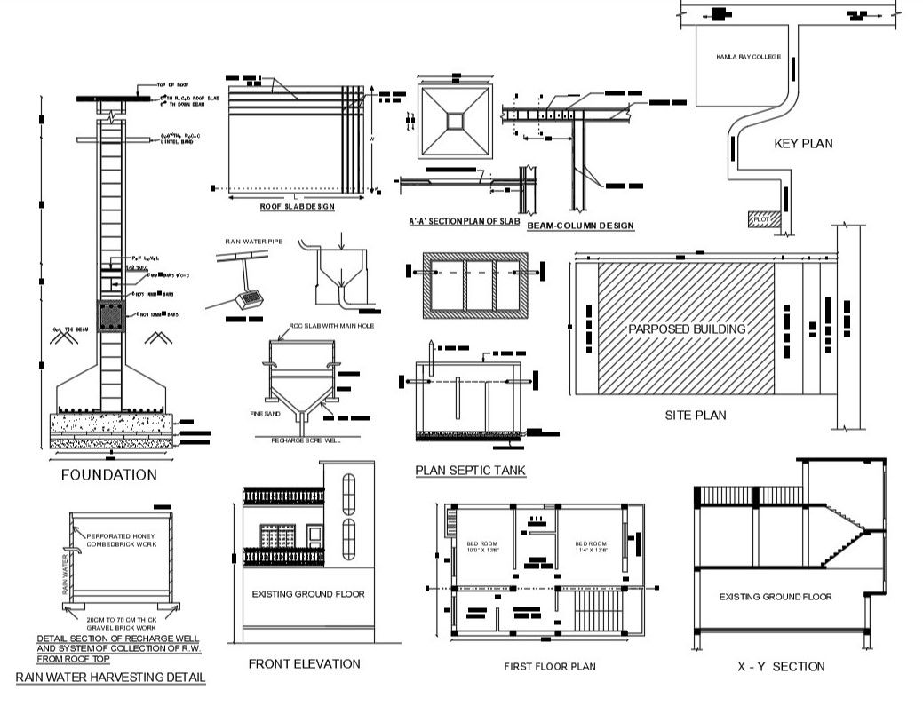 2D CAD drawing of residence house 2 BHK floor plan, existing ground floor plan, beam-column design, roof slab, site purpose plan and key plan with rainwater harvesting system detail. download 2 bedrooms house project detail DWG file.