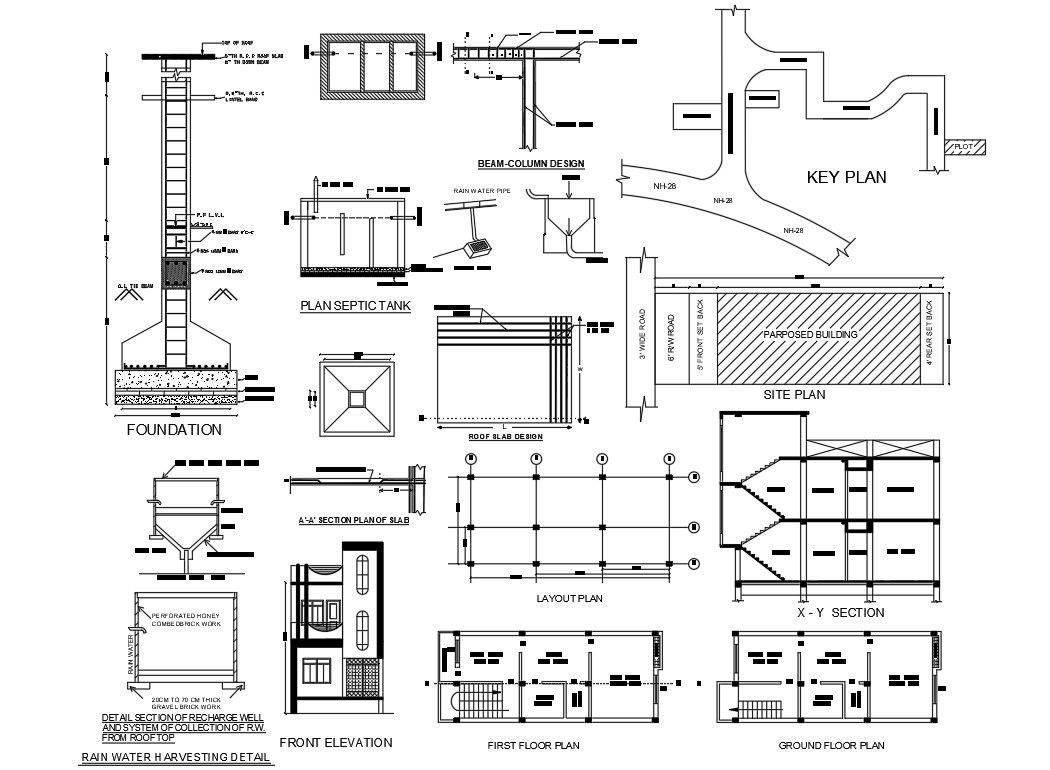 AutoCAD house ground floor plan and first-floor plan with front elevation design and section drawing that shows 2 storey building structure design. also has column centre line and slab section drawing. download residence house project CAD file.