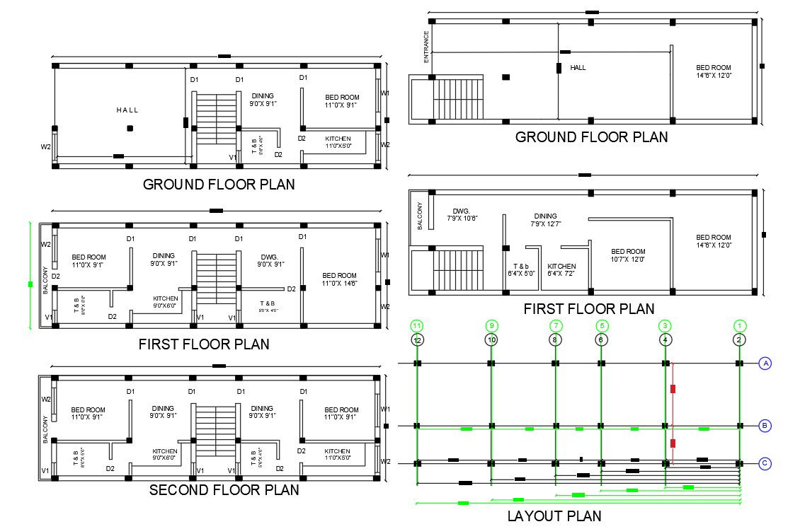 2D CAD drawing of 1 BHK and 3 BHK residence apartment floor plan with column layout and centre lien and dimension detail. download apartment plan project DWG file.
