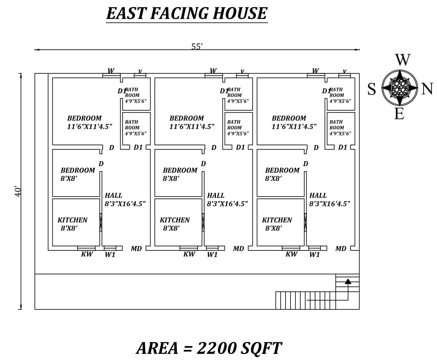 Autocad Drawing file shows 55'X40' The Perfect 2bhk East facing Row House Plan As Per Vastu Shastra. The total buildup area of this house is 2200 sqft. This drawing file contains 3 flats, In the first flat, The kitchen is in the Southeast direction The living area is available in the Northeast direction. The master bedroom is available in the southwest direction with the attached toilet is in the northwest. kid's bedroom/Drawing room is in the south direction. The common toilet is available in the west.In the second flat, The kitchen is in the Southeast direction The living area is available in the Northeast direction. The master bedroom is available in the southwest direction with the attached toilet is in the northwest. kid's bedroom/Drawing room is in the south direction. The common toilet is available in the west. In the third flat, The kitchen is in the Southeast direction The living area is available in the Northeast direction. The master bedroom is available in the southwest direction with the attached toilet is in the northwest. kid's bedroom/Drawing room is in the south direction. The common toilet is available in the west. A staircase is available in the northeast Direction outside of the house. Portico is available in the east direction of the house. Road Available in the east direction.Download Autocad Drawing file and PDF file.