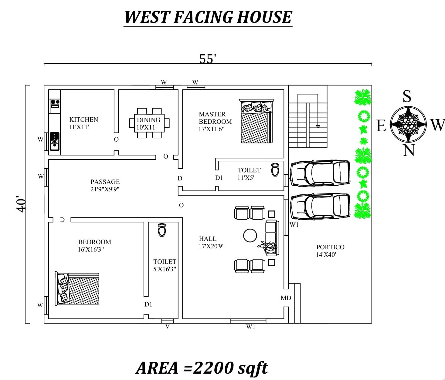 Autocad Drawing file shows 55'X40' Marvelous 2bhk West facing House Plan As Per Vastu Shastra. The total buildup area of this house is 2200 sqft. The kitchen is in the Southeast direction. The Dining is in the south. The Hall is Placed in the Northwest direction of the house. The master bedroom is available in the southwest direction with the attached toilet available in the west direction. kid's bedroom is in the Northeast direction with the attached toilet available in the north direction. A staircase is available on the southwest outside of the house. Portico/car parking is available in the northwest direction of the house. Download Autocad Drawing file and PDF file.