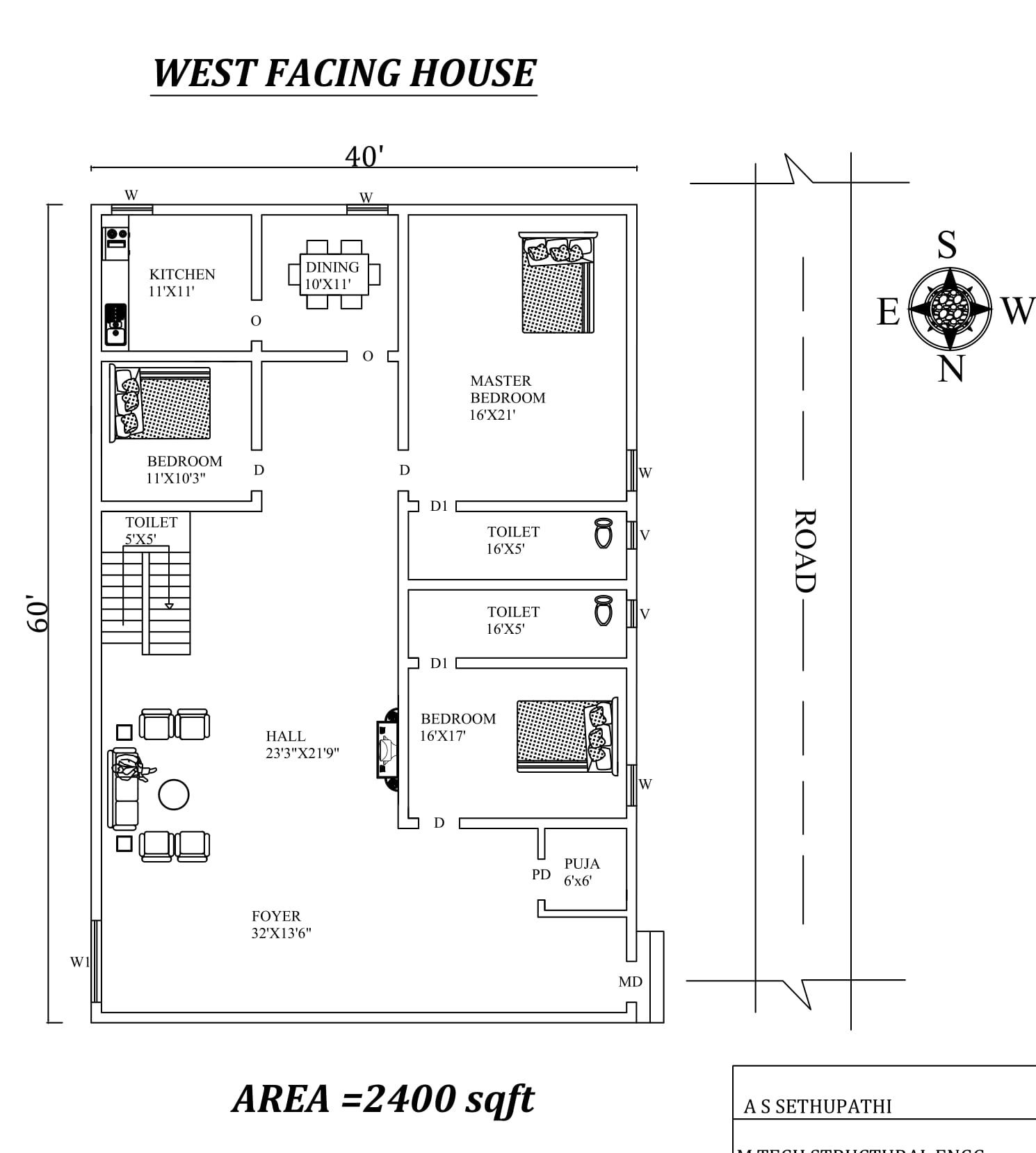 Autocad Drawing file shows 40'X60' Marvelous Furnished 3bhk West facing House Plan As Per Vastu Shastra. The total buildup area of this house is 2400 sqft. The kitchen is in the Southeast direction. The Dining is in the south. The puja room is in the west. The Hall is Placed in the Northeast direction of the house. The master bedroom is available in the southwest direction with the attached toilet available in the west direction. The kid's bedroom is in the west direction with the attached toilet available in the west direction. The guest bedroom is in the east. A staircase is available on the east inside of the house. The Common toilet is in the east under stairs. Download Autocad Drawing file and PDF file.