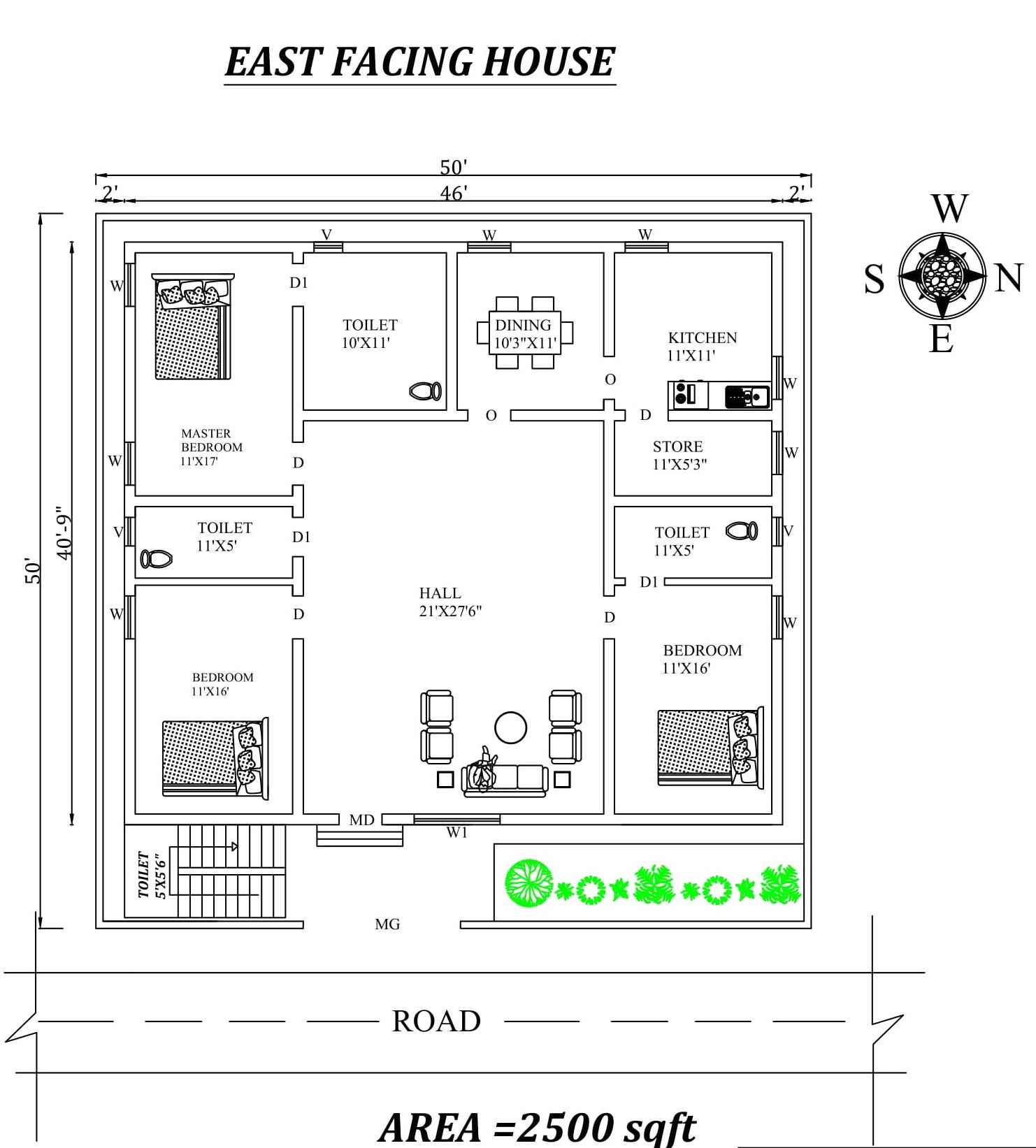 Autocad Drawing file shows 50'X50' Superb East Facing 3BHk House Plan As Per Vasthu Shastra. The total buildup area of this house is 2500 sqft. The kitchen is in the northwest direction. Dining near the kitchen is in the west direction. The Hall Placed in the east direction. The master bedroom is available in the southwest direction with the attached toilet is in the west direction. kid's bedroom is in the Northeast direction with the attached toilet available in the north direction. The guest bedroom is available in the southeast direction. A staircase is available in the southeast outside of the house. Download Autocad Drawing file and PDF file.