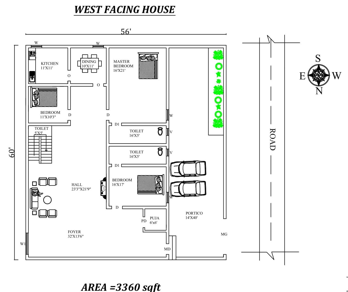 Autocad Drawing file shows 56'X60' Marvelous Furnished 3bhk West facing House Plan As Per Vastu Shastra. The total buildup area of this house is 3360 sqft. The kitchen is in the Southeast direction. The Dining is in the south. The puja room is in the west. The Hall is Placed in the Northeast direction of the house. The master bedroom is available in the southwest direction with the attached toilet available in the west direction. The kid's bedroom is in the west direction with the attached toilet available in the west direction. The guest bedroom is in the east. A staircase is available on the east inside of the house. The Common toilet is in the east under stairs. Download Autocad Drawing file and PDF file.