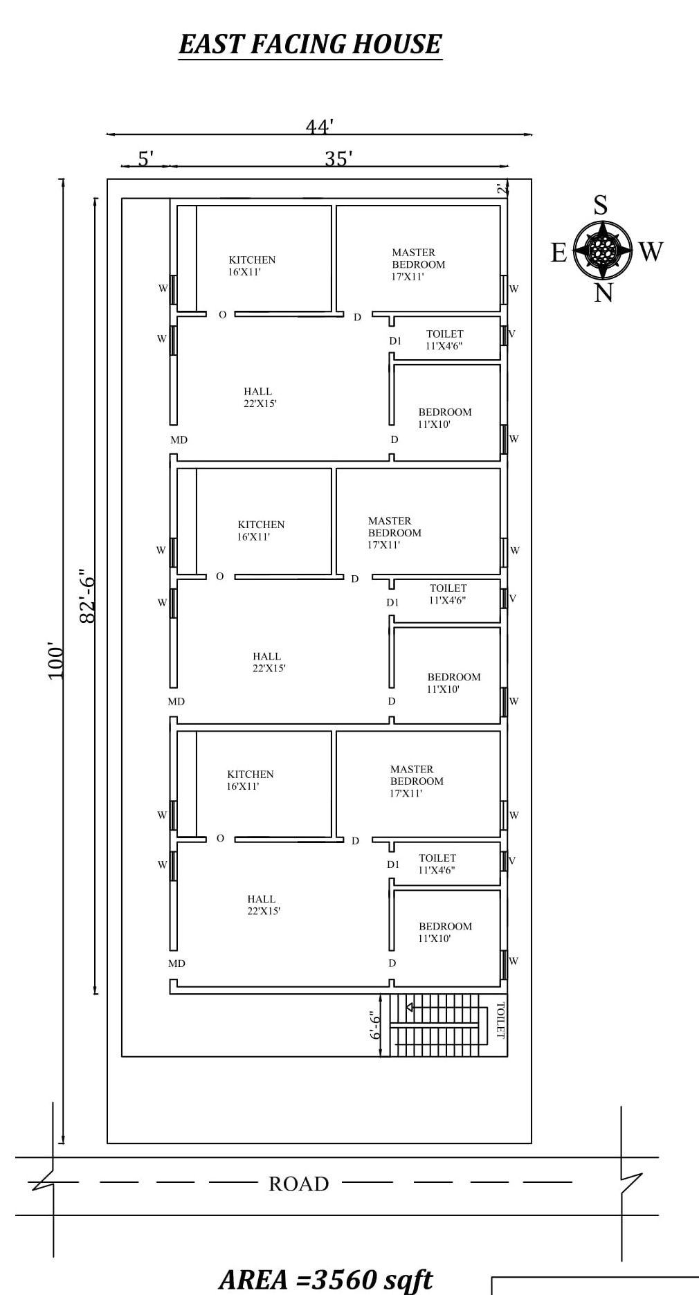 Autocad Drawing file shows 44'X100' The Perfect 2bhk East facing Trible row House Plan As Per Vastu Shastra. The total buildup area of this house is 3560 sqft. The drawing file contains three-row flats all sizes are the same. The kitchen is in the Southeast direction. The living area is available in the Northeast direction. The master bedroom is available in the southwest direction. kid's bedroom is in the northwest direction. The common toilet is available in the west. A staircase is available in the northwest Direction outside of the house. Road Available in the east direction.Download Autocad Drawing file and PDF file.