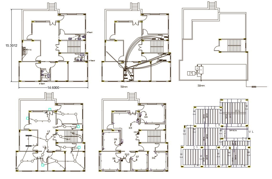 48 X 50 feet plot size of 3 BHK house electrical and plumbing layout plan design that shows ceiling light point, wiring and switches detail. also has plumbing pipe line plan design. download house plan with column slab bar structure design DWG file.