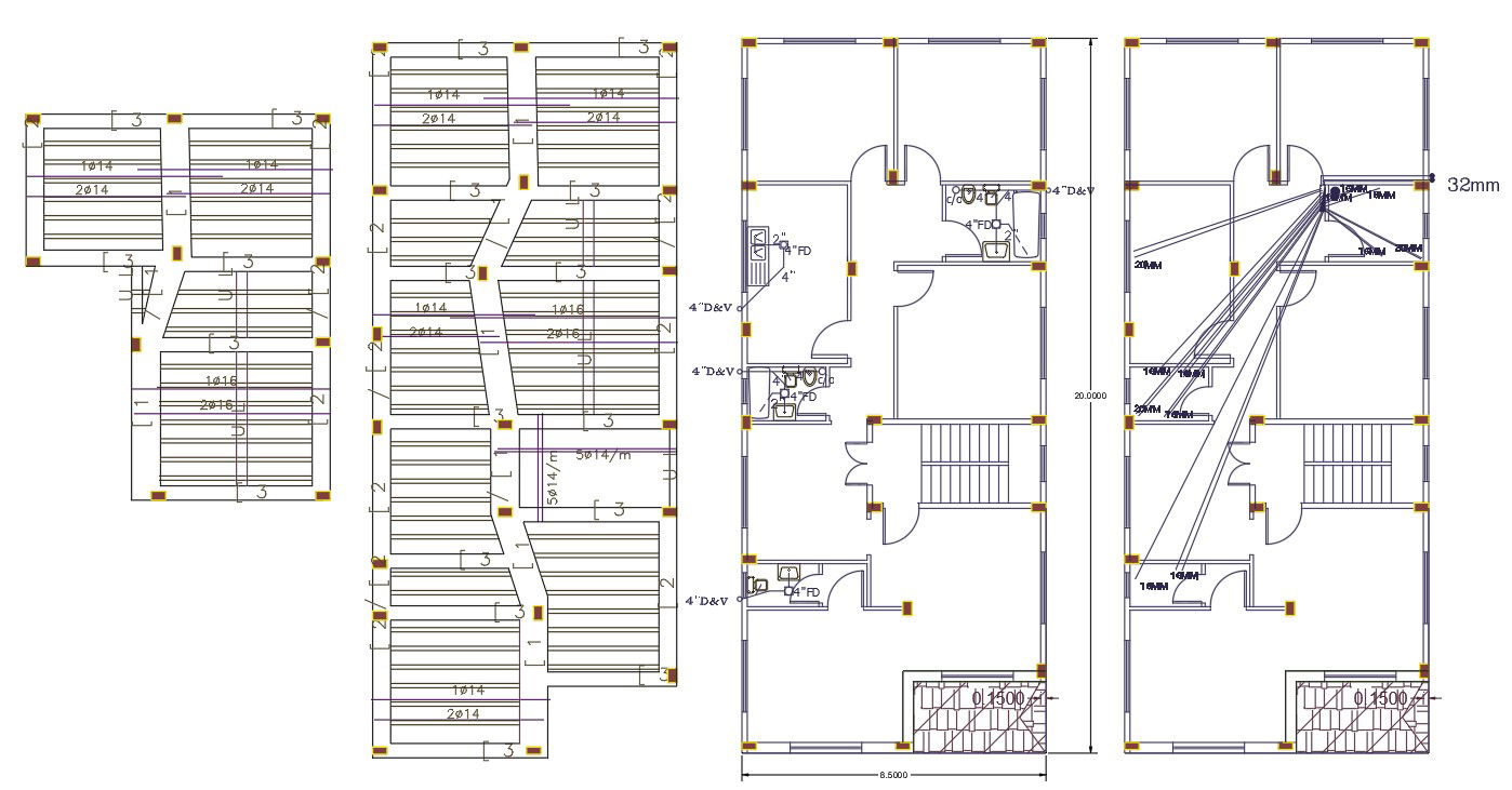 2D CAD drawing of 3 BHK house plumbing layout plan design column slab bar structure design also has sanitary ware detail with piping plan. download 3 bedroom house plan design AutoCAD file.