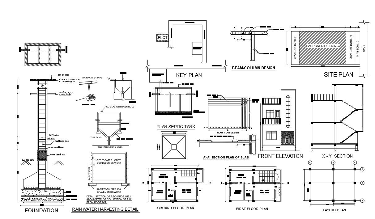 2D CAD drawing of architecture residence house complete project that shows floor plan, kay plan. beam-column design, and rainwater harvesting detail. download house project with septic tank design DWG file.