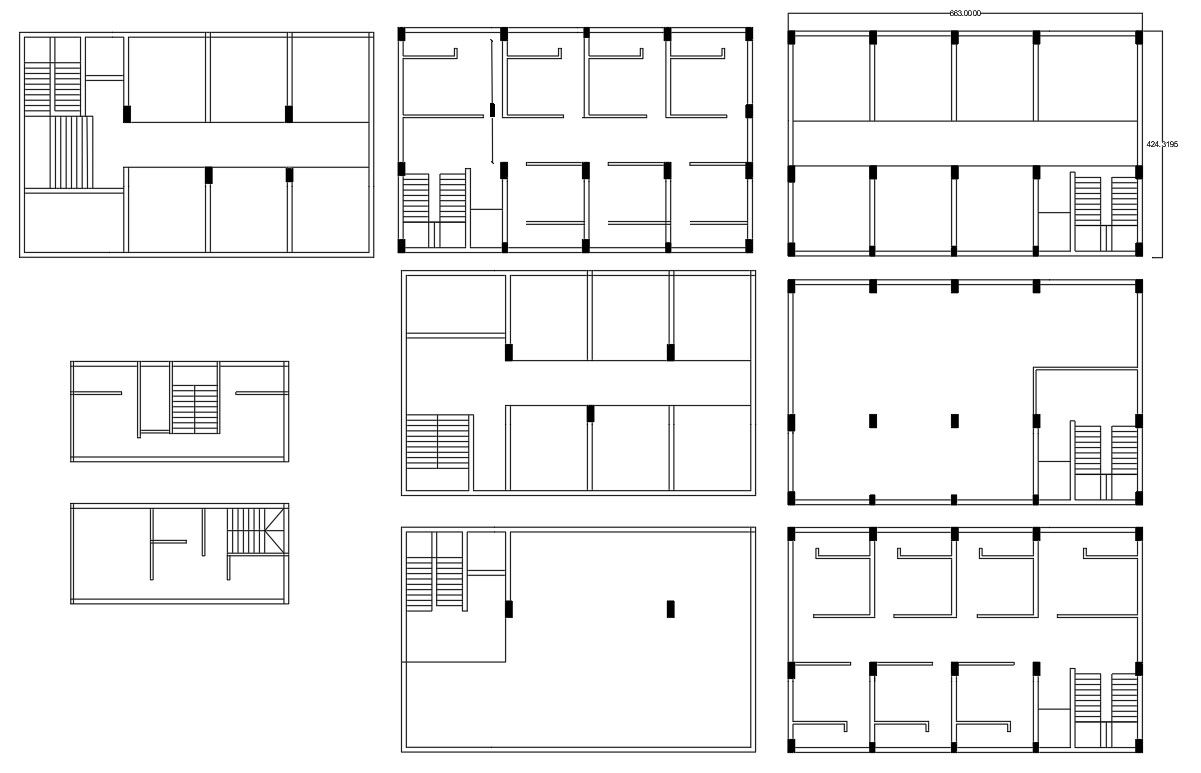 Download Free DWG file of commercial building different floor plan with column layout design and staircase detail.