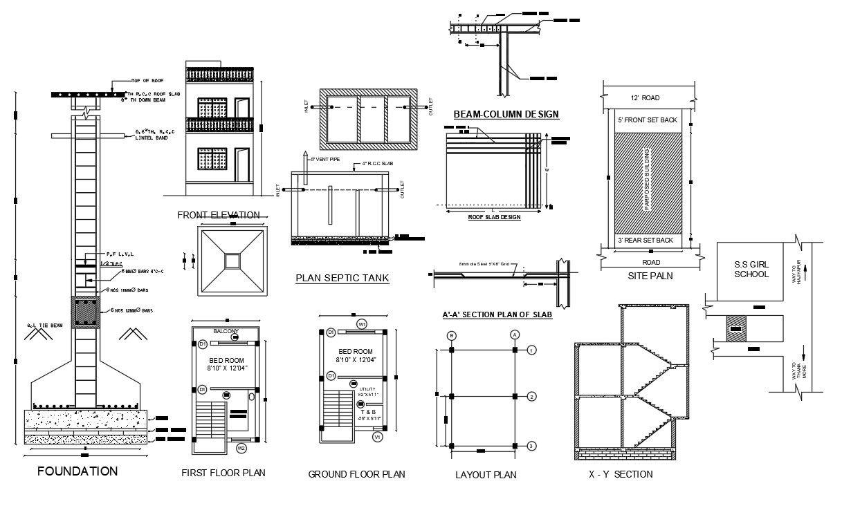 AutoCAD drawing of small house ground floor and first-floor plan design that shows 2 bedrooms, kitchen, dining area and toilet. also has column center line plan, foundation, kay plan, section drawing and front elevation design with the septic tank. download house project with key plan AutoCAD file.