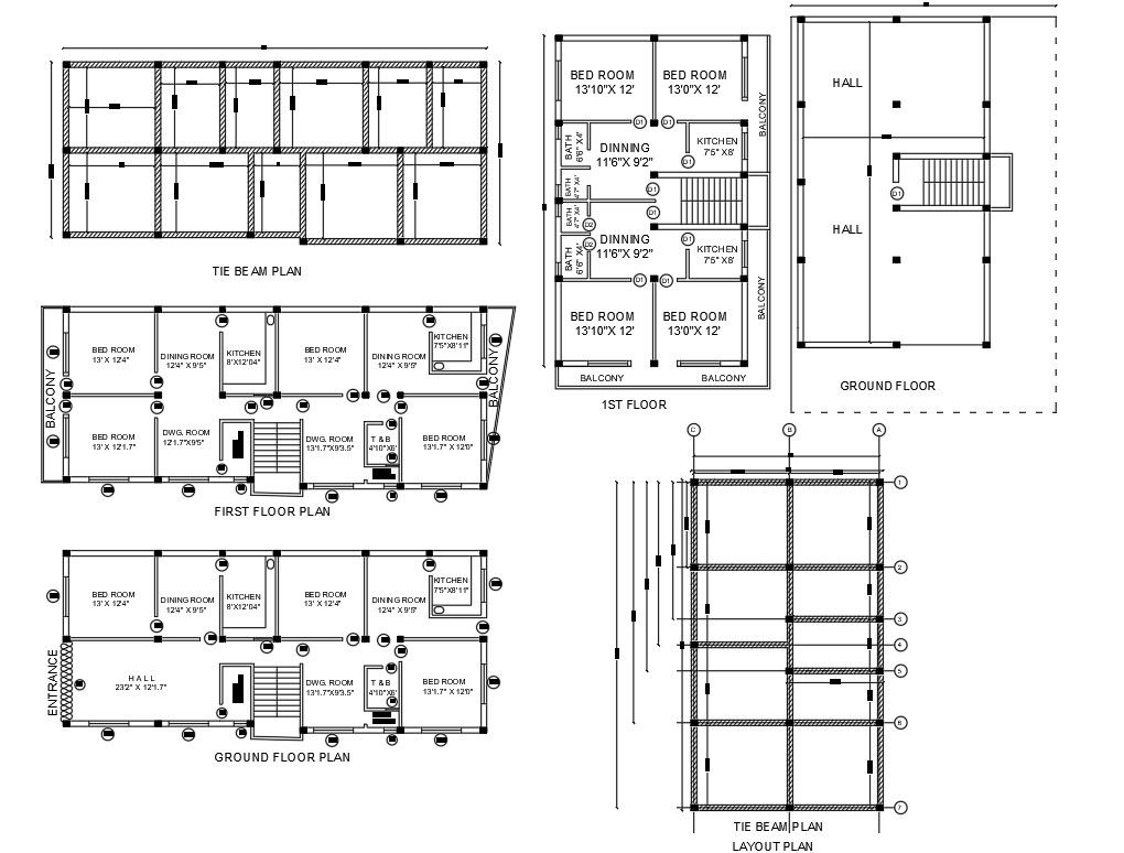 AutoCAD drawing of residence house floor plan design that shows 1 BHK and 2 BHK plan design with the tie-beam plan with dimension detail. download 13' X 12' feet bedrooms house plan design DWG file.